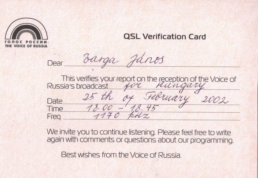 MW, QSL, VoR Voice of Russia on 1170 KHz március 22, 2002 VoR QSL card. I am listening the Hungaryan service. Frequency: 1170 KHz Date: 2002.02.25 Time on UTC: 18:00 – 18:45 The QSL card received at 2002.03.22 Előző Voice of Russia on 7310 KHz Legújabb Radio Romania International on 5965 KHz Ezeket is érdemes megnézni Radio Romania International on 855 KHz július 18, 2016 My radio’s – Yaesu FT-897D december 10, 2007 Weather ballons március 14, 2019