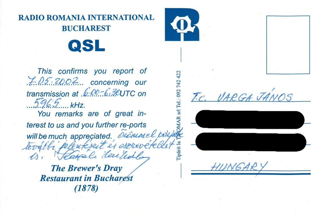 QSL, RRI, SW Radio Romania International on 5965 KHz május 31, 2002 Radio Romania International QSL card. I am listening the Hungaryan service. Frequency: 5965 KHz Date: 2002.05.07 Time on UTC: 6:00 – 6:30 The QSL card received at 2002.05.31 Előző Voice of Russia on 1170 KHz Legújabb RRI QSL from 9510 KHz and RRI Programmes Summer 2002 Ezeket is érdemes megnézni SDRplay SRPduo – My new toy! február 22, 2019 Radio Romania International on 855 KHz július 18, 2016 Radio Romania International on 153 KHz április 19, 2016