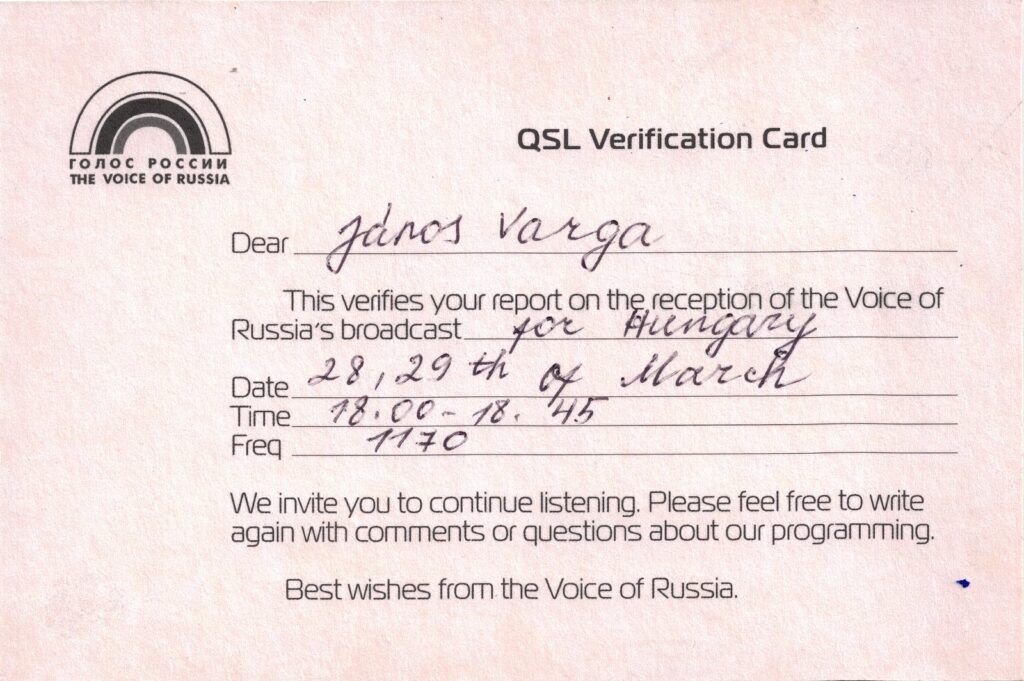 MW, QSL, VoR Voice of Russia on 1170 KHz június 17, 2002 VoR QSL card. I am listening the Hungaryan service. Frequency: 1170 KHz Date: 2002.03.28 and 2002.,3.29 Time on UTC: 18:00 – 18:45 The QSL card received at 2002.06.17 Előző Voice of Russia on 11745 KHz Legújabb Voice of Russia on 1170 KHz Ezeket is érdemes megnézni Voice of Russia on 11745 KHz június 17, 2002 My radio’s – AOR AR-2002 október 10, 2015 Voice of Russia on 1530 KHz június 17, 2002