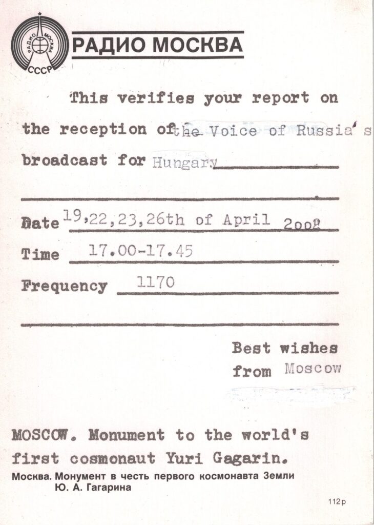 MW, QSL, VoR Voice of Russia on 1170 KHz június 17, 2002 VoR QSL card. I am listening the Hungaryan service. Frequency: 1170 KHz Date: 2002.04.19, 2002.04.22, 2002.04.23 and 2002.04.26 This day’s I ma tested my new home brew loop antenna. The antenna is very good! Time on UTC: 17:00 – 17:45 The QSL card received at 2002.06.17 Előző Voice of Russia on 1170 KHz Legújabb Voice of Russia on 7400 KHz Ezeket is érdemes megnézni Voice of Russia on 1170 KHz március 22, 2002 Deutscher Wetterdienst DDK2 on 4583 KHz március 10, 2016 Vesti FM on 1413 KHz február 11, 2019