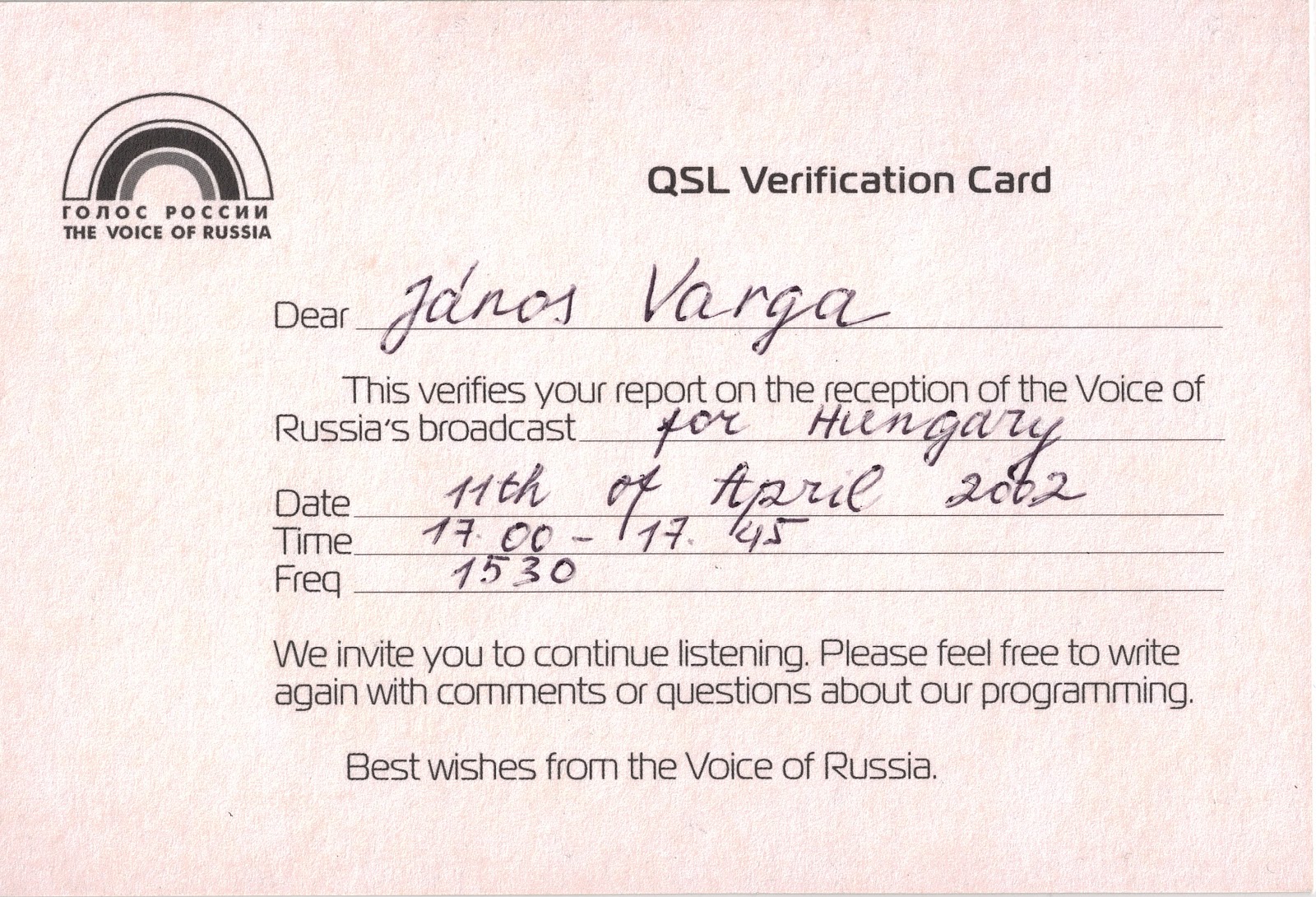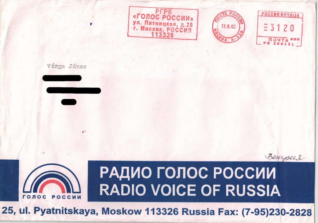 MW, QSL, VoR Voice of Russia on 1530 KHz június 17, 2002 VoR QSL card. I am listening the Hungaryan service. Frequency: 1530 KHz Date: 2002.04.11 Time on UTC: 17:00 – 17:45 The QSL card received at 2002.06.17 Előző RRI QSL from 9510 KHz and RRI Programmes Summer 2002 Legújabb Voice of Russia on 11745 KHz Ezeket is érdemes megnézni RRI on 630KHz február 18, 2016 Deutscher Wetterdienst DDK2 on 4583 KHz március 10, 2016 FRG-7700 memória modul május 1, 2024