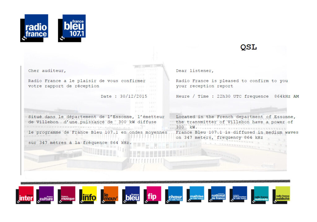 France Bleu QSL card. I am listening the France Bleu for a few days before MW services is terminated.