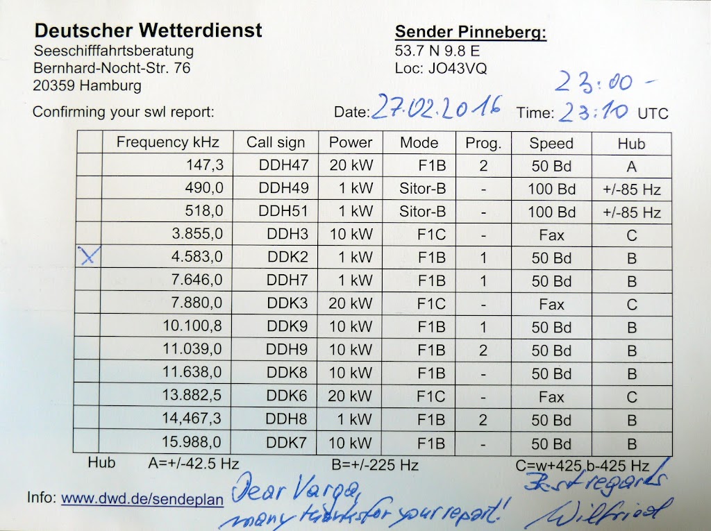 This is to inform you, that I listened to your station 27.02.2016 between 23:00 and 23:10 UTC. You were broadcasting on 4583 KHz.