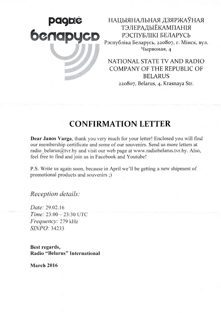Это должно сообщить вам, что я слушал вашу станцию 29.02.2016 с 23:00 до 23:30 UTC. Вы транслировали на 279 КГц.