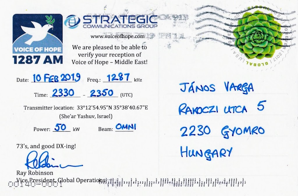 Remarks: VOICE OF HOPE – MIDDLE EAST – 1287 AM (Galilee, Israel) Syria, Lebanon, Jordan, Cyprus and Israel.