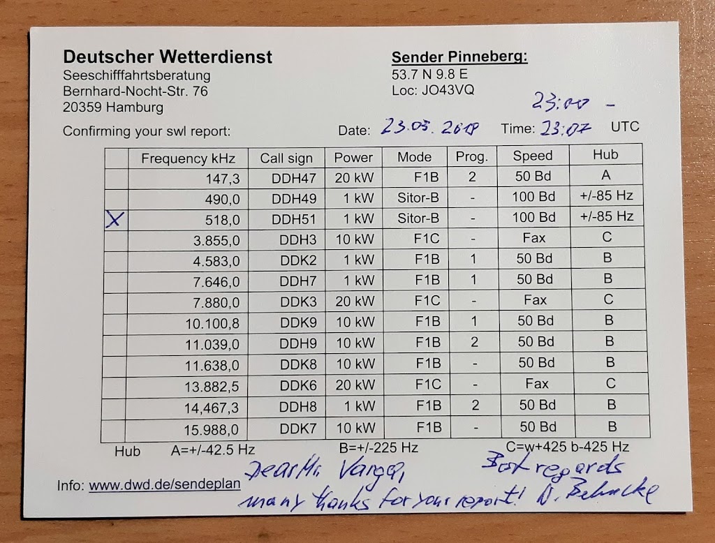Our transmitter is located in Pinneberg about 15 km north of Hamburg. We are transmitting national NAVTEX on 490 kHz as well.