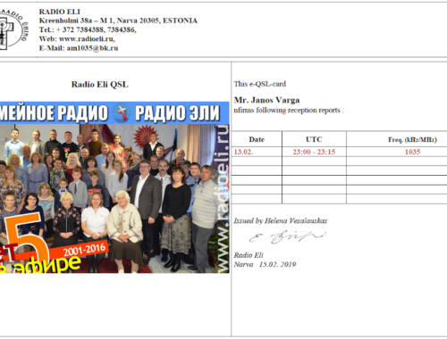 Radio: Radio EliFreq: 1035 KHzLanguage: RussianDate: 13/02/2019Time on UTC: 23:00.- 23:15SINPO: 44444RX: Yaesu FRG-8800Ant: 20 meter long wire with tunerQTH: near BudapestConfirmed my report in e-QSL The QSL card received at 15/02/2019 I sending my report the am1035@bk.ru email address.…