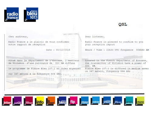 France Bleu QSL card. I am listening the France Bleu for a few days before MW services is terminated. Frequency: 864 KHz Date: 2015.12.30 Time on UTC: 22:30 – 23:00 The QSL card received in email at 2016.01.15 France Blau emai…